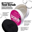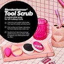 Image 1 - The image shows a white Beautyblender Blendercleanser Tool Scrub container with a pink lid partially open, revealing a black charcoal exfoliating solid soap embossed with Beauty blender, and includes text that states: Blenderclenser® Tool Scrub A smarter way to purify, prolong, and enhance the performance of your tools, Natural scrub grains are embedded into the soap for ultimate deep-cleaning effects, Beauty blender. Blenderclenser® Tool Scrub charcoal extra strength exfoliating solid soap, Canister is designed to provide a mess-free cleansing experience, Solid formulation is TSA-friendly & easy-to-pack, and Charcoal-infused formula draws out the most stubborn makeup, grime, and germs from deep within tools. Image 2 - A hand with pink nail polish is washing a pink beauty blender sponge in a white tub of solid black cleanser, creating white soap bubbles, with the text Blendercleanser® Tool Scrub ultimate tool wash for any of your makeup tools, Beautyblender, and refresh. scrub. rinse. Image 3 - A pink tiled surface features a pink makeup sponge, a beige sponge labeled Beautyblender, an open jar of dark scrub labeled Beautyblender, and a closed pink jar labeled Blendercleanser® Tool Scrub on a pink tray, alongside a pink glass, a pink toothbrush holder with two purple toothbrushes, and cassette tape earrings that say A DAY TO REMEMBER; a large black speech bubble overlay on the left contains text: Blendercleanser® Tool Scrub, A sustainable soap for all makeup tools, Internal scrub system eliminates the need for plastic exfoliant pad, Fast-acting and deep-cleansing formula requires less water use, Routine tool cleaning prolongs performance, so you dont need to replace your Beautyblender® as often.