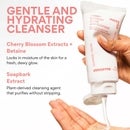 Image 3 - A persons hand squeezes clear gel cleanser from a white tube onto their other open hand, with the surrounding text reading GENTLE AND HYDRATING CLEANSER, Cherry Blossom Extracts + Betaine, Locks in moisture of the skin for a fresh, dewy glow, Soapbark Extract, Plant-derived cleansing agent that purifies without stripping, and text on the tube itself reading innisfree, CHERRY BLOSSOM GLOW JAM CLEANSER, FACIAL CLEANSING FOAM, MOUSSE NETTOYANTE VISAGE, CLEANSE + GLOW, innisfree, NETTOI, 150ml, 5.07 FL.OZ. Image 4 - A white tube of Innisfree Cherry Blossom Glow Jam Cleanser with scattered pink petals features the text EXP 07/2026, CHERRY BLOSSOM GLOW JAM CLEANSER™, FACIAL CLEANSING FOAM, MOUSSE NETTOYANTE VISAGE, Innisfree, CLEANSE + GLOW, FREE, NETTOIE + ÉCLAT, 150 mL, 5.07 Fl.Oz., alongside the headline BOOST YOUR GLOW!, and survey results indicating 100% felt that the product gently cleanses make-up on the skin without irritation* and 86% felt that this product leaves refreshing finish on the skin without residue*, with a disclaimer stating *Based on a 14-day independent consumer study on 30 women aged 20-35. Image 5 - A person smiles while holding a white tube of Innisfree Cherry Blossom Glow Jam Cleanser, with overlay text that reads WHO IS THIS GOOD FOR? Dull skin, Gentle cleansing lovers, Daily use without tightness, Dehydrated or normal to combination skin, and the tube itself lists Facial Cleansing Foam, Mousse Nettoyante Visage, Nettoie + Éclat, 150 mL, and 5.07 Fl. Oz.