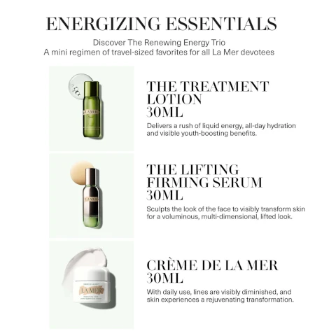 The La Mer The Renewing Energy Trio offers a curated collection of mini essentials infused with the brand’s signature Miracle Broth™, perfect for refreshing skin on the go or adding a touch of luxury to your everyday routine.