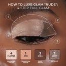 Image 1 - The image features piled eyeshadow swatches in various rosy, brown, and shimmery pink tones with text that reads: LUXE GLAM COMPACT quad eyeshadow palette ROSY NATASHAS ICONIC SIGNATURE FORMULAS SPARKLING FOILED Pure chromatic high-foiled finish CREAMY MATTE Buttery-smooth & intensely pigmented finish METALLIC Pure chromatic high-foiled finish. Image 10 - Three square eyeshadow pans of different sizes and finishes are displayed on a white background with descriptive text: LUXE GLAM COMPACT quad eyeshadow palette, Mini Original Pan Size *ft. in Mini Eye Sculpt, Large Original Pan Size *ft. in Luxe Glam Compact, Iconic Midi Pan Size *ft. in I Need A Nude. Image 2 - A womans face is split vertically to show two different makeup looks, with the left side featuring a subtle day look and the right side a more shimmery night look, captioned DAY LOOK NIGHT LOOK. Image 3 - Close-up of an eye with a four-step guide for applying rosy eyeshadow, showing numbered application areas on the eyelid and four eyeshadow swatches below labeled 2 Affinity Metallic, 1 Shell Transition Matte, 3 Messa Dark Matte, and 4 Lucent Sparkling Foiled, with the title HOW TO LUXE GLAM ROSY: 4-STEP FULL GLAM. Image 4 - The image displays three swatches of eyeshadow powder in shades of dark brown, shimmery bronze, and matte peach, alongside text that reads LUXE GLAM COMPACT quad eyeshadow palette NUDE NATASHA’S ICONIC SIGNATURE FORMULAS SPARKLING FOILED Pure chromatic high-foiled finish CREAMY MATTE Buttery-smooth & intensely pigmented finish. Image 5 - A split image of a womans face shows a subtle day makeup look on the left and a dramatic night makeup look on the right, with the text DAY LOOK NIGHT LOOK below. Image 6 - A close-up of an eye shows a four-step eyeshadow application guide with different shades outlined on the eyelid, and below are four eyeshadow swatches with names and finishes: HOW TO LUXE GLAM NUDE: 4-STEP FULL GLAM, 4 FLUTTER SPARKLING FOILED, 1 ATIK TRANSITION MATTE, 3 SHEA DARK MATTE, 2 DRIFT METALLIC. Image 7 - Three textured swatches of eyeshadow powder, one dark brown, one shimmering rose gold, and one shimmering silver, are displayed on a white background, next to text that reads LUXE GLAM COMPACT quad eyeshadow palette COOL NATASHAS ICONIC SIGNATURE FORMULAS SPARKLING FOILED Pure chromatic high-foiled finish CREAMY MATTE Buttery-smooth & intensely pigmented finish METALLIC Pure chromatic high-foiled finish. Image 8 - A womans face is shown with two distinct makeup styles, separated by a vertical line: a natural look on the left and a dramatic, smoky look on the right, with text Day Look Night Look. Image 9 - An eye is shown with a four-step eyeshadow application guide using numbered areas for different shades, presented alongside four corresponding eyeshadow swatches, with the visible text HOW TO LUXE GLAM COOL: 4-STEP FULL GLAM, 4 SKIFT SPARKLING FOILED, 1 STONE TRANSITION MATTE, 3 OPART DARK MATTE, 2 HUSH METALLIC.