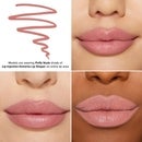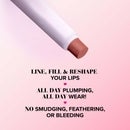Image 2 - A lip product with a rounded tip is shown against a soft pink background, featuring the text that reads LINE, FILL & RESHAPE YOUR LIPS, followed by hearts and the phrases ALL DAY PLUMPING, ALL DAY WEAR! and NO SMUDGING, FEATHERING, OR BLEEDING.