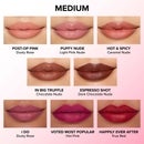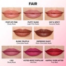 Image 4 - Image shows a variety of lip colors on fair skin tones, labeled from top to bottom: Post-Op Pink (Dusty Rose), Puffy Nude (Light Pink Nude), Hot & Spicy (Caramel Nude), In Big Truffle (Chocolate Nude), Espresso Shot (Dark Chocolate Nude), I Do (Dusty Rose), Voted Most Popular (Hot Pink), and Happily Ever After (True Red).
