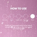 - Application: Shake well. Spray each section of hair before styling with tongs, wraps or blow outs to hold your style all day.