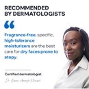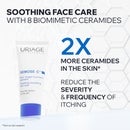 Image 1 - A white and blue tube of Uriage Xemos C8+ face care product is displayed with the text: SOOTHING FACE CARE WITH 8 BIOMIMETIC CERAMIDES, URIAGE EAU THERMALE, XEMOSE C8+, Soin visage nourrissant apaisant, Soothing nourishing face care, Peaux très sèches, Very dry skin, 2X MORE CERAMIDES IN THE SKIN*, REDUCE THE SEVERITY & FREQUENCY OF ITCHING, *Test on skin explant. Image 2 - A close-up of a woman applying a white cream to her cheek with visible text that reads VERY DRY SKIN PRONE TO ATOPIC ECZEMA, SOOTHING FACE CREAM, NON-STICKY & NON-GREASY, FRAGRANCE-FREE. Image 3 - A petri dish containing pale yellow cream and green bubbly liquid is displayed alongside text that reads ADVANCED DERMATOLOGICAL FORMULA, 10% SHEA BUTTER & SQUALANE, The combination with ceramides regenerates physical barrier & leaves the skin intensely nourished & protected. Image 4 - A close-up of a glowing orange molecular structure with connected spheres on a white background, with visible text reading KEY INGREDIENT 8 BIOMIMETIC CERAMIDES TO BOOST BOTH QUANTITY & DIVERSITY OF SKIN CERAMIDES* *Test on skin explant. Image 5 - The image displays promotional text on a white background to the left of a blurred skin texture, with two superimposed circular badges, featuring the text: EXCLUSIVE PATENTS, REDUCES ITCHING SENSATIONS, PROVIDES LONG-LASTING RELIEF, BREVET URIAGE CERASTEROL .2F URIAGE PATENT, and BREVET URIAGE CHRONO - XINE URIAGE PATENT. Image 6 - An image with the heading Committed To Healthy Skin, featuring three icons with descriptions: a dermatologist with a stethoscope and text Developed & Recommended by Dermatologists, a feather over skin layers with text Suitable for Dry Skin Prone to Atopy, and a crossed-out perfume bottle with text Fragrance-Free. Image 7 - A smiling woman with braided hair wears a white shirt on the right side, with text on the left that reads: RECOMMENDED BY DERMATOLOGISTS. Fragrance-free, specific, high-tolerance moisturizers are the best care for dry faces prone to atopy. Certified dermatologist Dr. Emma Amoafo-Mensah. Image 8 - A collection of URIAGE EAU THERMALE XEMOSE C8+ skincare products for very dry skin prone to atopy is displayed, including a jar of Cérat relipidant anti-grattage Lipid-replenishing anti-itch cerat 6.8 fl.oz., a large pump bottle of Baume relipidant anti-grattage Lipid-replenishing anti-itch balm 500mle, a yellow tube of Huile lavante anti-grattage Anti-itch cleansing oil 200mle, a white tube of Soin visage nourrissant apaisant Soothing nourishing face care, a small white tube of Soin palpébral nourrissant apaisant Soothing nourishing palpebral care, and a white spray bottle of Brume SOS anti-grattage SOS anti-itch mist 200mle, all containing 8 BIOMIMETIC CERAMIDES.